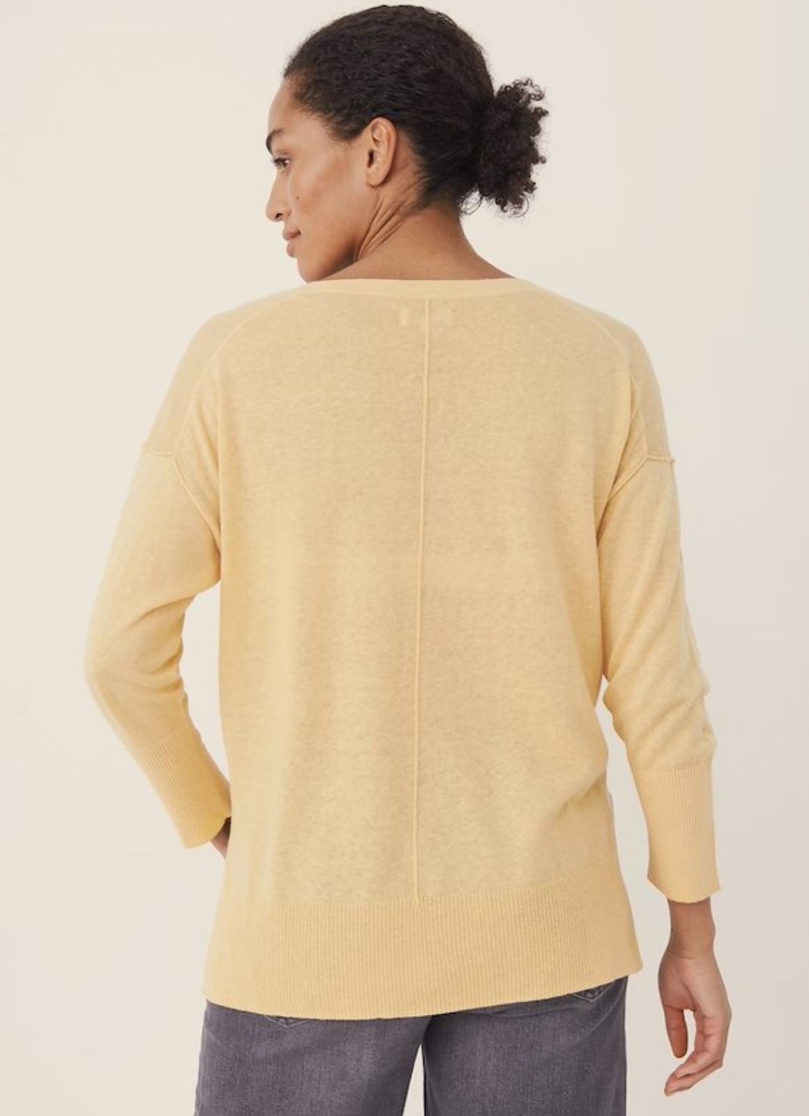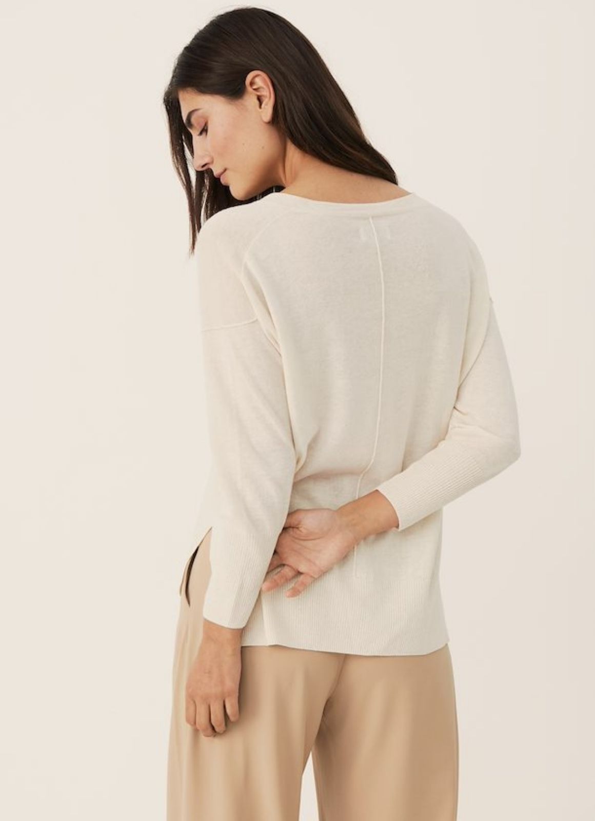 A relaxed fit v neck knitted pullover features a small side slit detail.