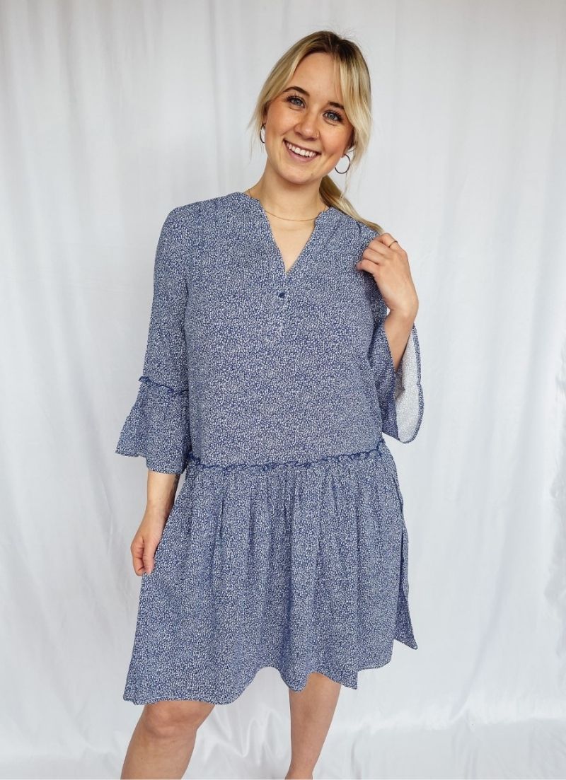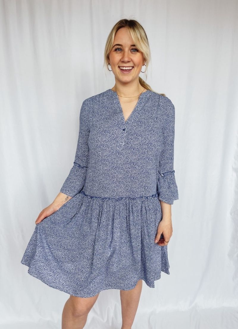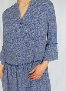 The Sophia Dress is a knee length dress with a tiered, ruffle hem. With complimenting ruffle 3/4 sleeves. It features a v neck with a button closure.