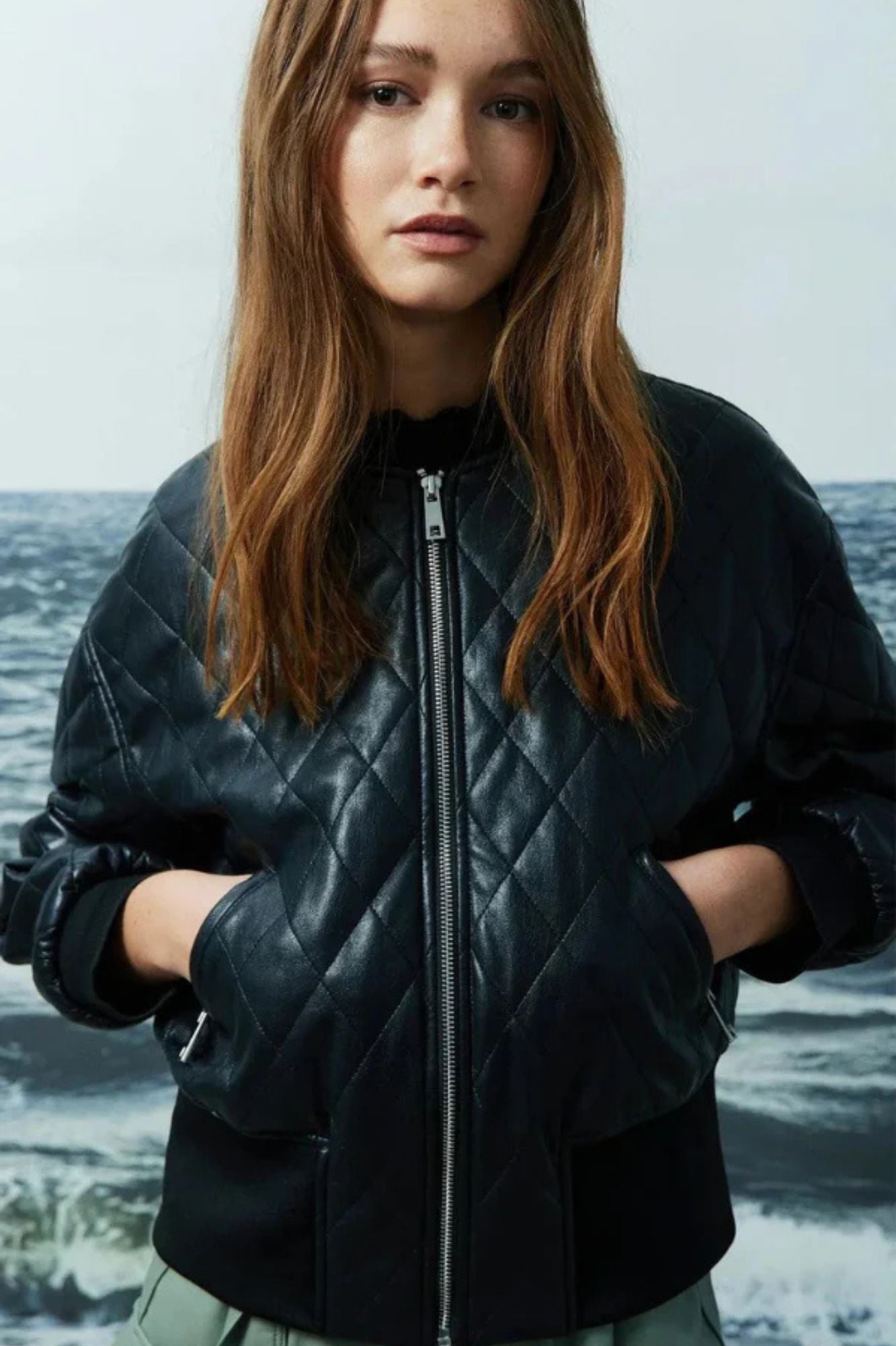 Introducing the Pia Quilted Leather Jacket, your new favorite layering piece for fall. Made with sustainable vegan leather, this bold bomber features front zip pockets, a zip front closure, and a classic silhouette. Add some edge to your outfit with this stylish jacket.