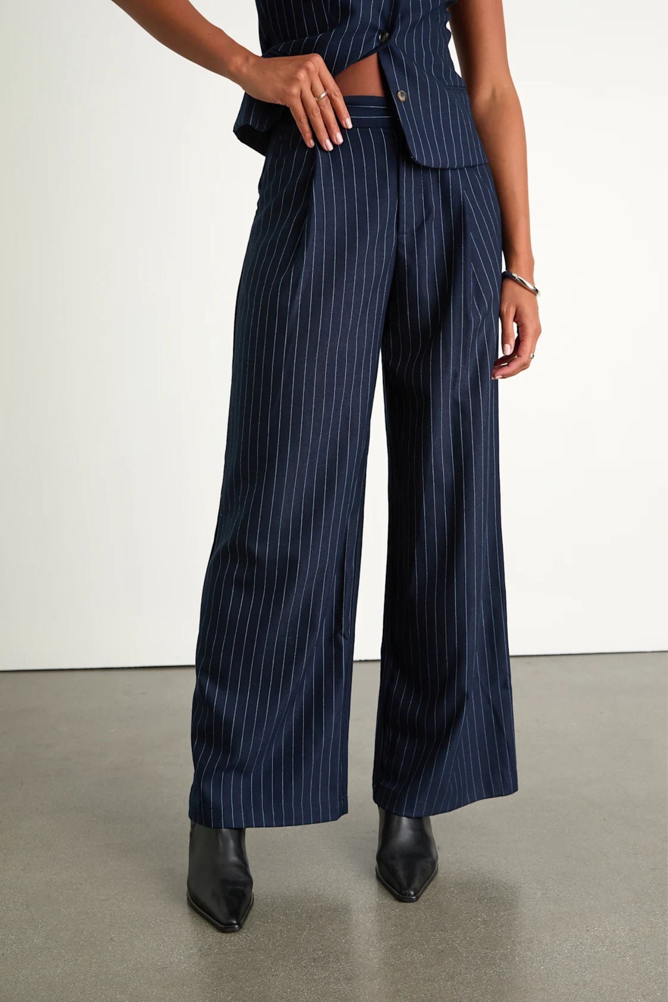 These pinstriped trousers by The Korner are your secret weapon for effortless sophistication. The lightweight woven fabric drapes beautifully from a high-rise cut, while pleated details and wide legs deliver that coveted tailored vibe. Hidden zip fly, belt loops, and functional pockets keep things practical, but it's the crisp pinstripes that steal the show—dress them up for the office or pair with a tee for weekend cool. A timeless piece that works as hard as you do.