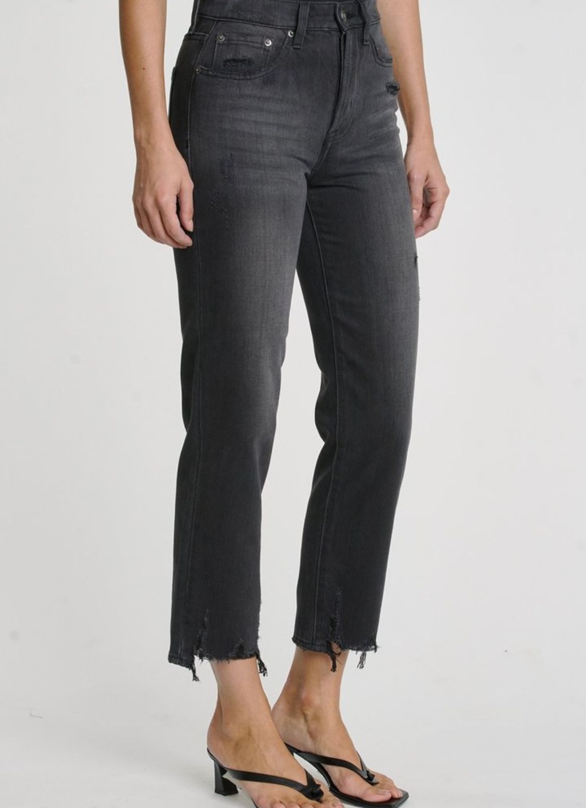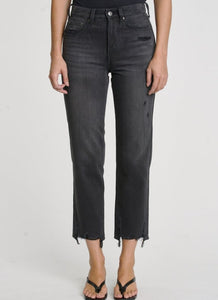 The Charlie is a high rise straight leg denim. This style in the 6AM wash features a a frayed hem on a dark denim