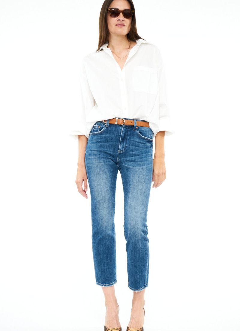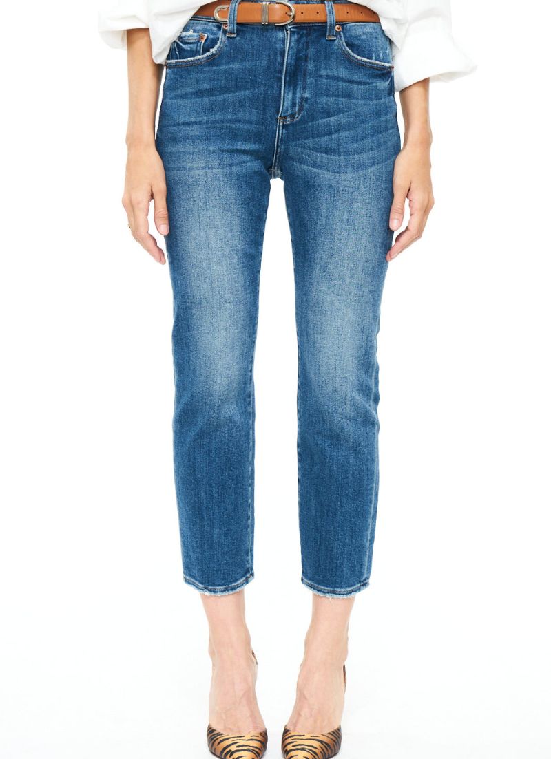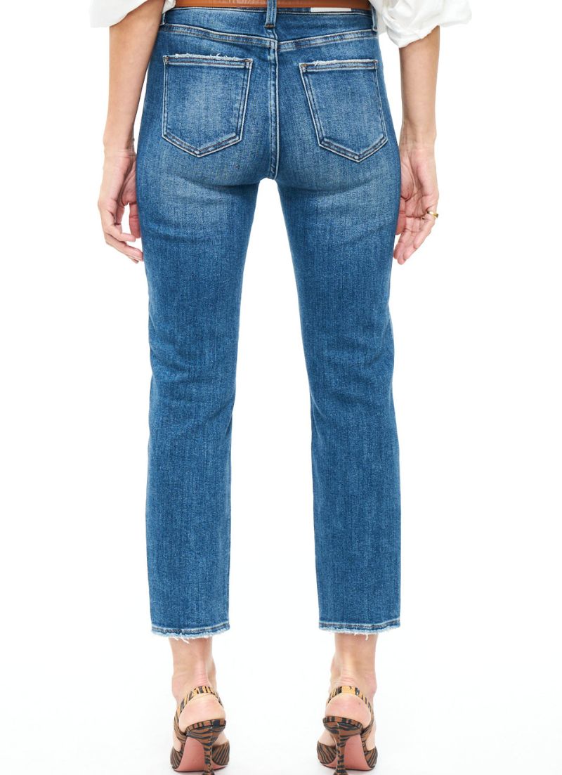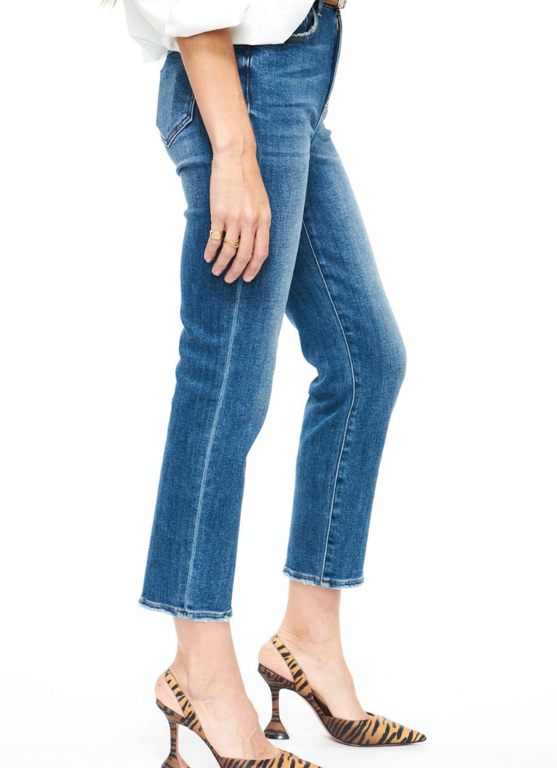 The Monroe is the perfect high rise, super stretch slim cigarette jean. This style lands above the ankle and comes in a timeless medium wash with subtle distressing at the hems.