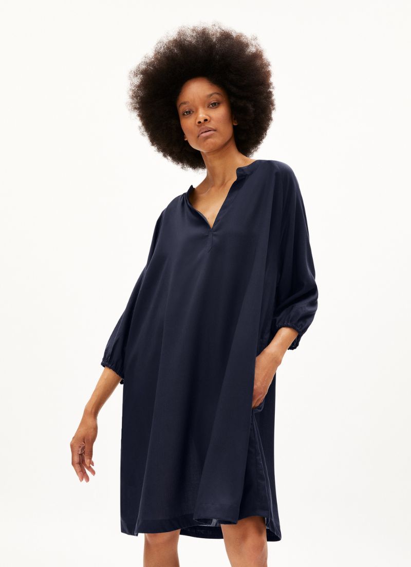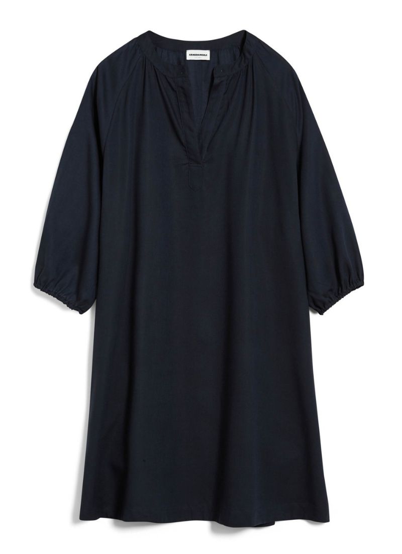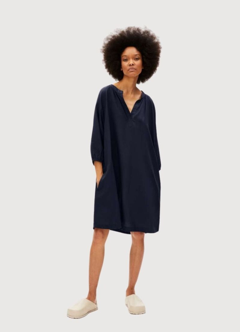 A super airy blouse dress with an open collar and 3/4 length sleeves.