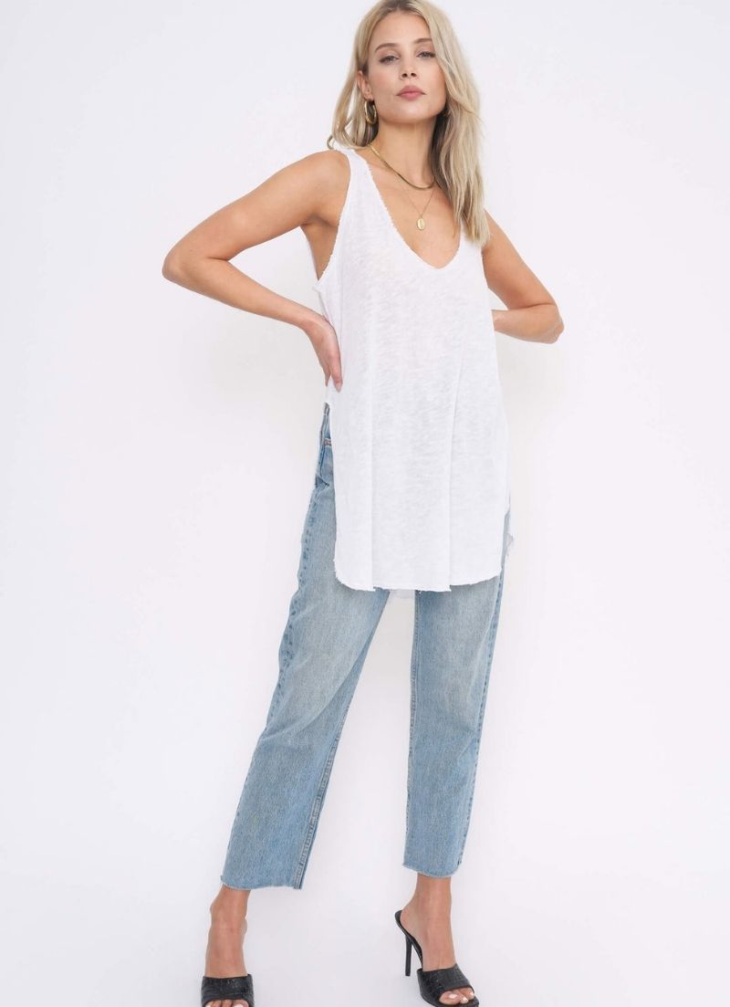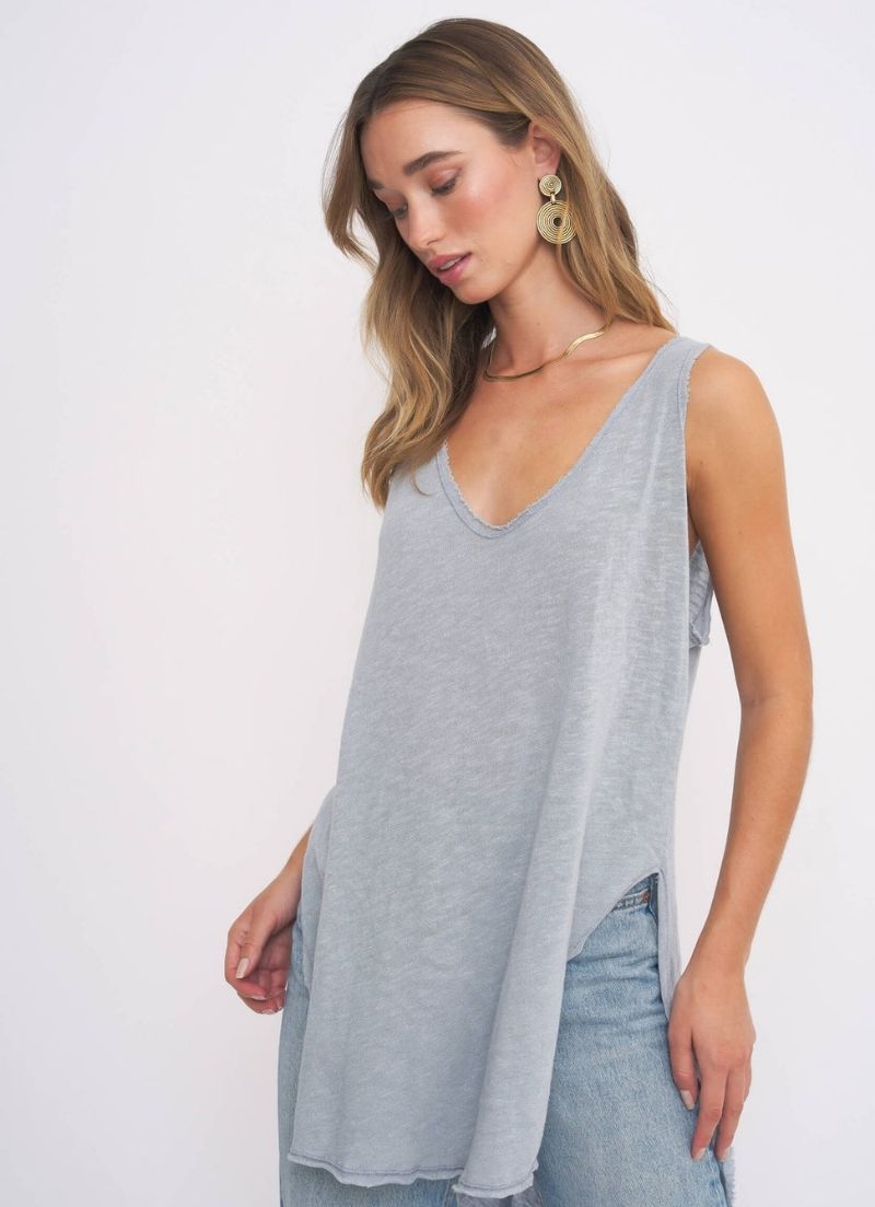 This tunic length v-neck neck tank features a rounded shirt tail hemline and high side slits for an incredibly flattering fit. Wear it with a knot tied to the side!