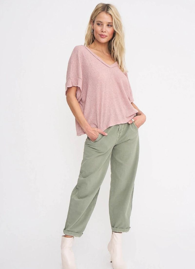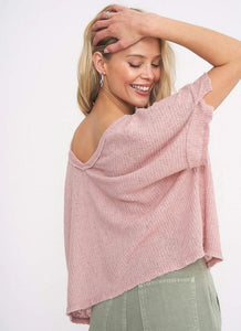 The Easy To Love Tee is just that. This tee is made from lightweight ribbed fabric and has a boxy fit with drop sleeve detail. It features a v cut on the front and back of the tee.