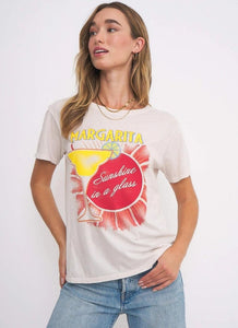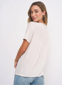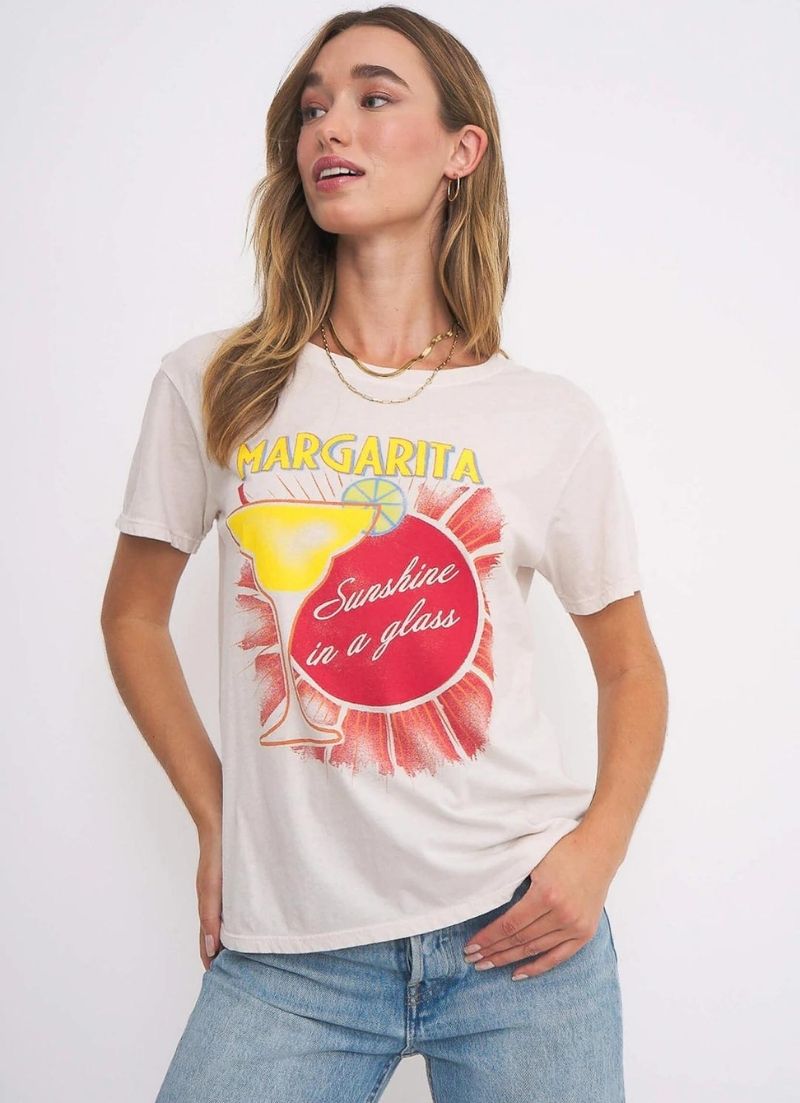 You are vacation ready with this tee. This tee is made from 100% cotton fabric. It has a fun graphic on the front and low hemline.