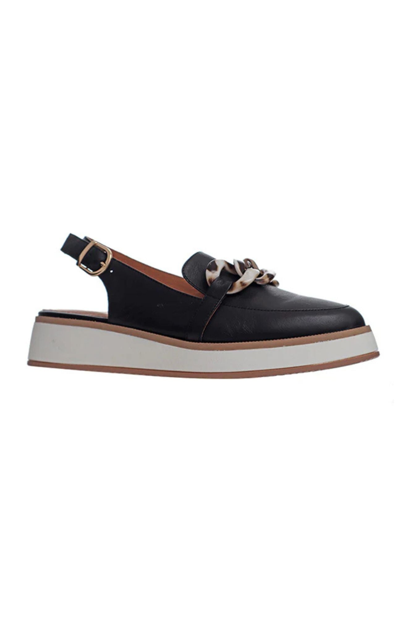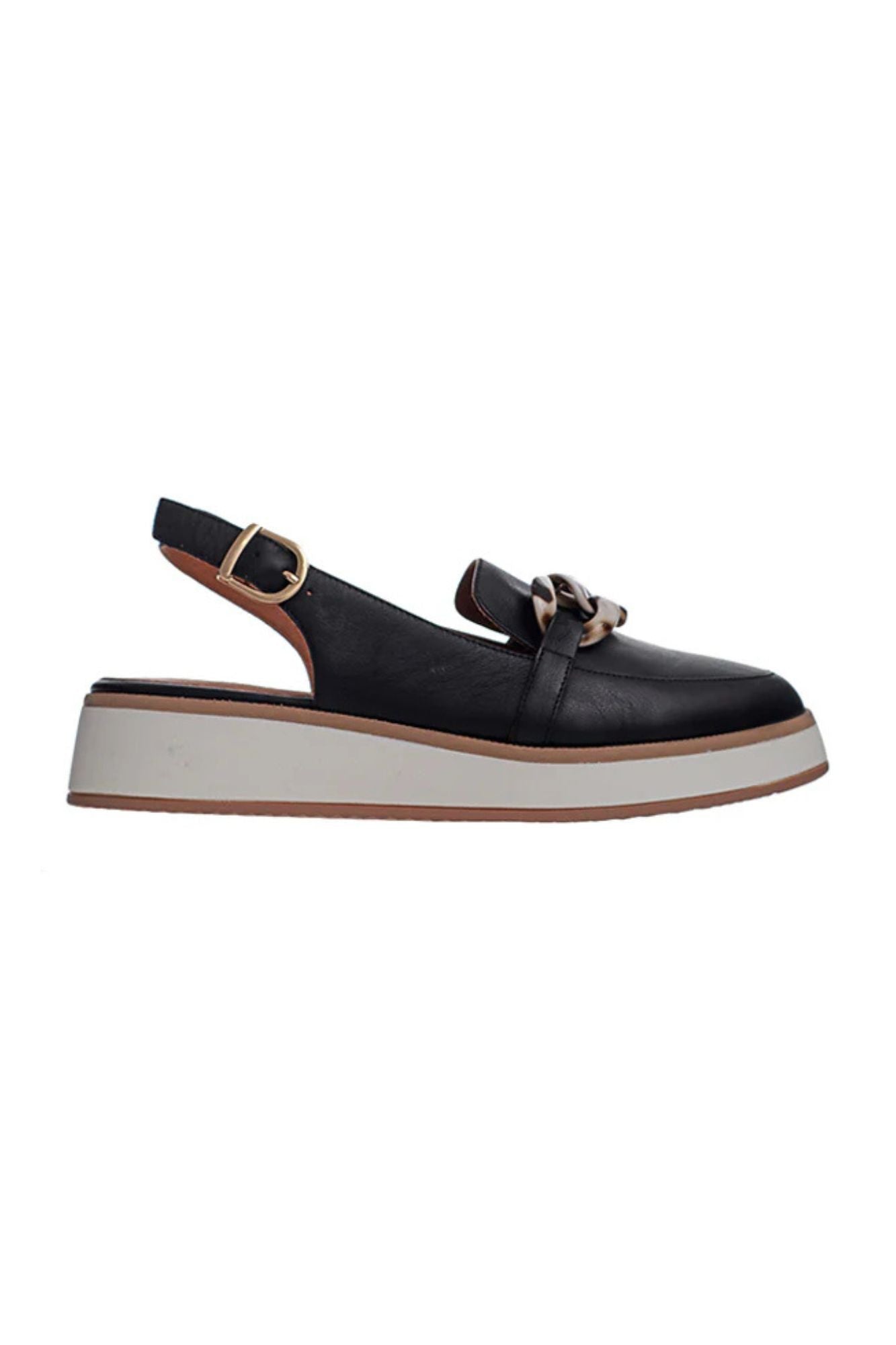 Introducing Quivers Closed Toe Sandal from Alfie & Evie. This sleek, light weight wedged platform loafer features soft black leather, a latex lined leather sock, and a slingback upper with a chic chainlink tortoise shell buckle trim. Perfect for combining style and comfort in one!