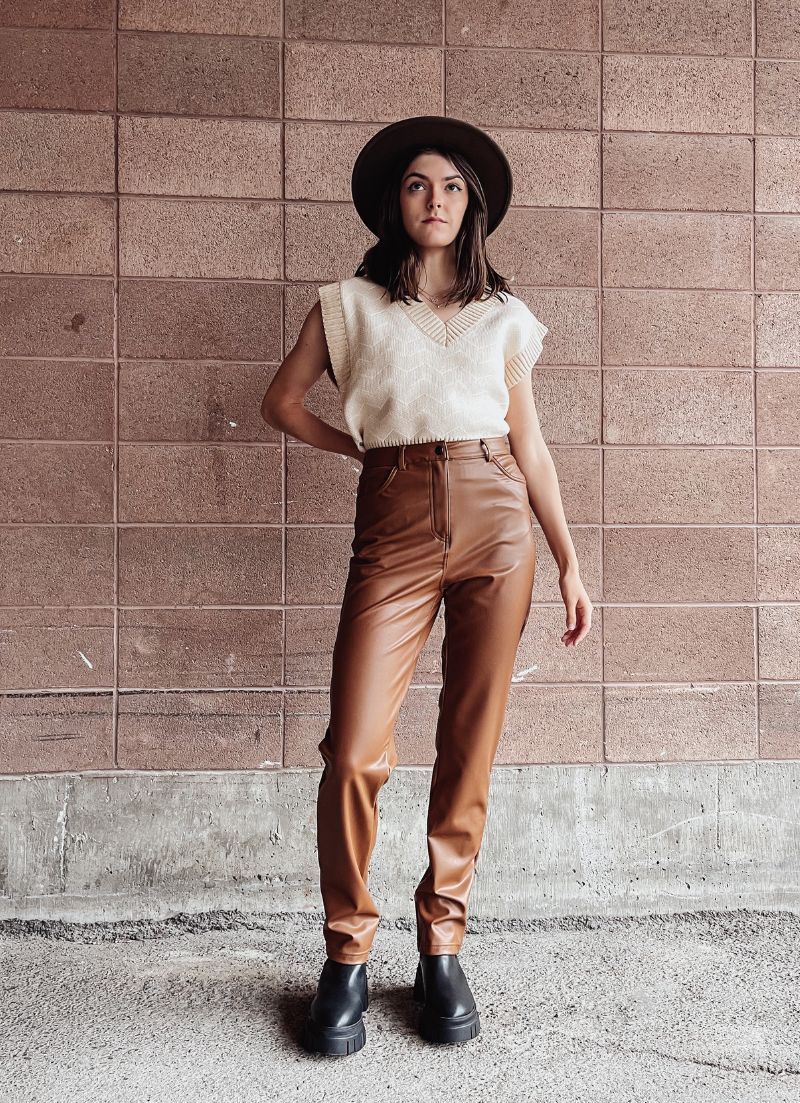 Faux leather pants are back and they're making a statement this Fall. The Kennedy Pant features five pockets, a high waist and straight fit. They're very stretchy and a great alternative to jeans. Pair with a chunky sweater and a pair of boots.