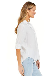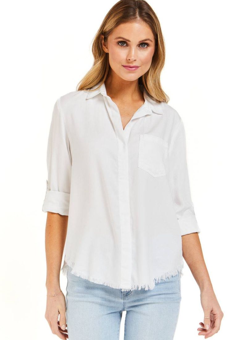 The Riley collared button down shirt features rolled tab sleeves, double chest pockets, a split back tail, and a frayed hem. This shirt is a perfect staple to any wardrobe.