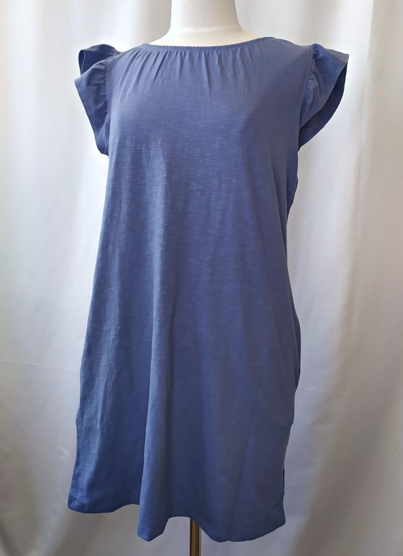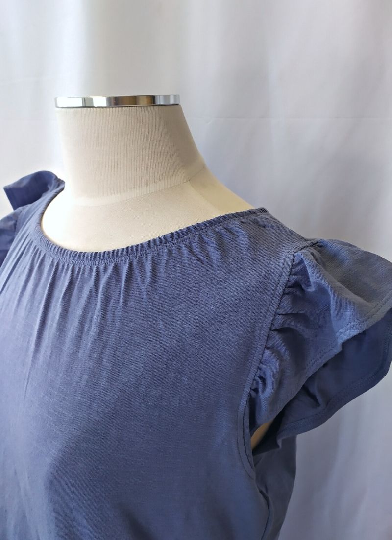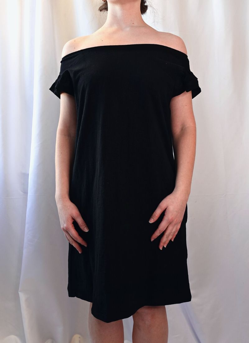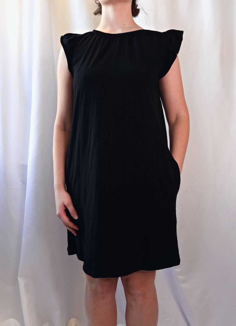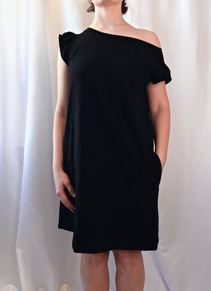The Ronnie dress features a 3-in-1 neckline that can be also worn off the shoulder and on one shoulder. It has mini ruffle sleeves.