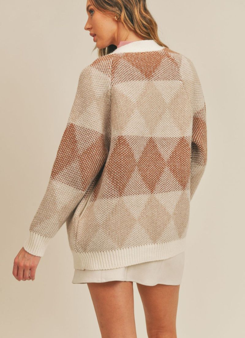 Rowan is an open front cardigan in an all argyle print with white trim details. Pairs well with a basic turtleneck or tee underneath.