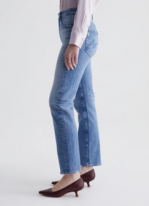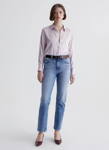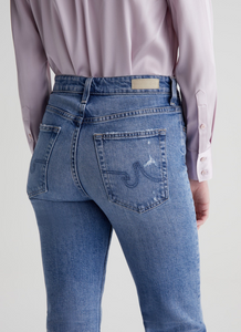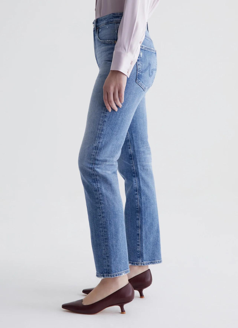 Saige is a women's high-rise straight jean, done here in a light wash with a 19-year AG-ed™ Denim finish. Made from 11.75 oz. Vintage Comfort Stretch Denim, these five-pocket jeans have fading, whiskering, and uneven wear at the hems for an authentic lived-in look.