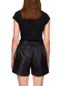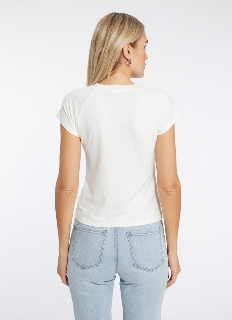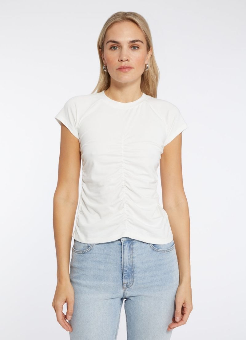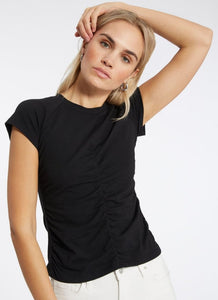 This form-fitting tee features rippled ruching down the front. This crew neck tee hits along the hips.