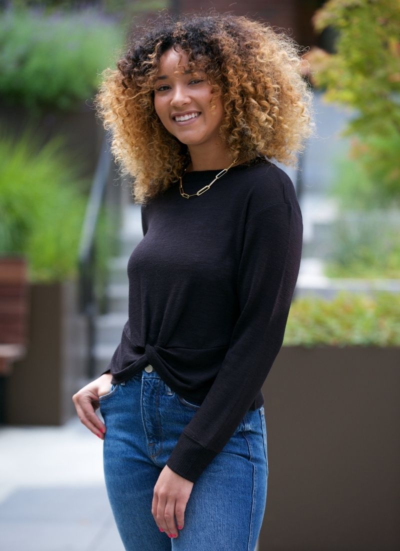 A lightweight long sleeve top featuring a knot tie in the front for some added detail.