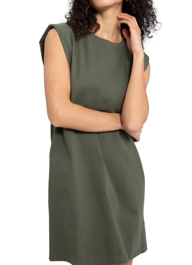 Similar to the Shoulder Pad Tee, this dress is lightweight and features a scoop neck with padded shoulders for a stylish affect.