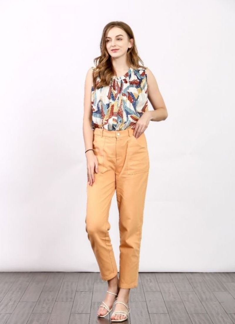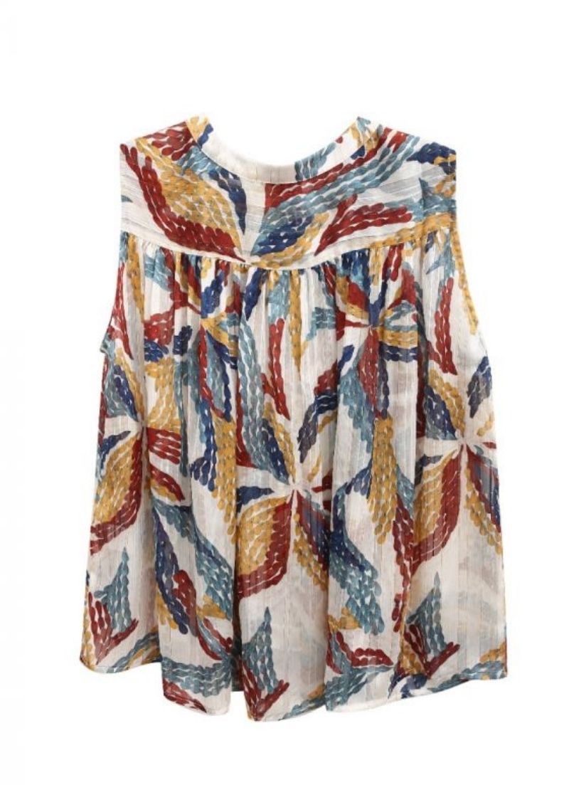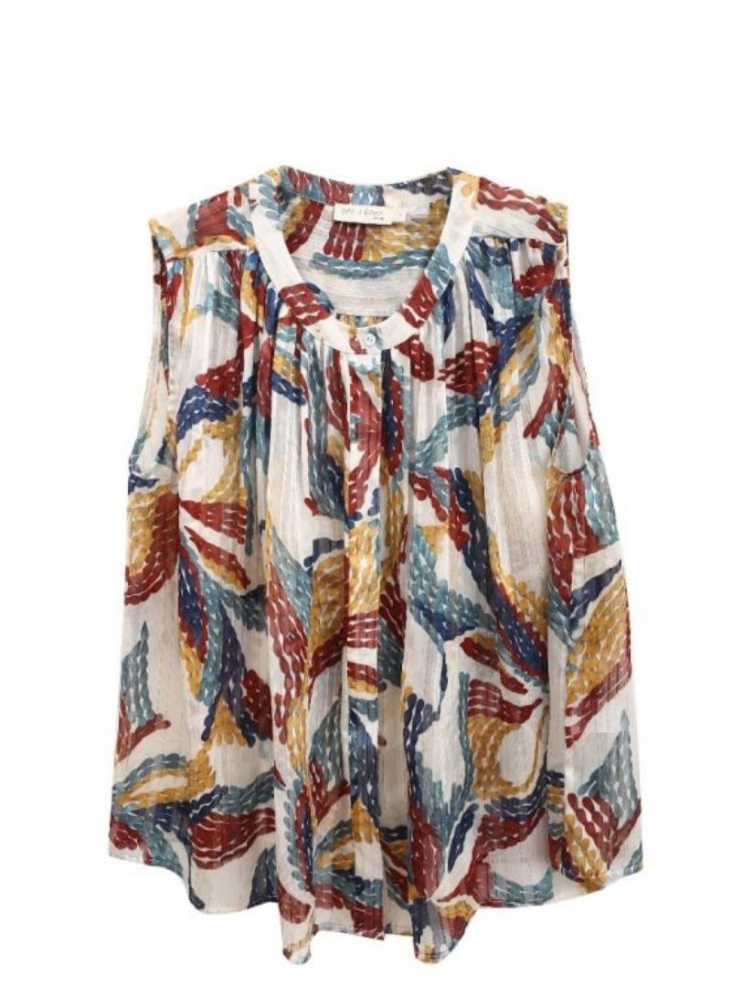 The Brielle Blouse is sleeveless featuring a scoop neck and buttons for detailing in a multi colour print.