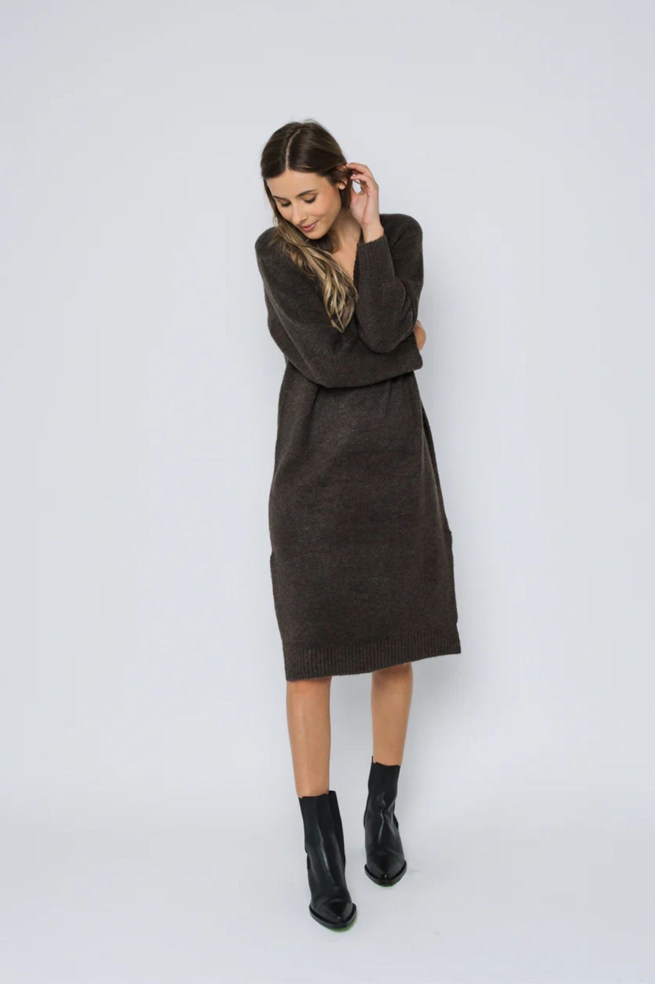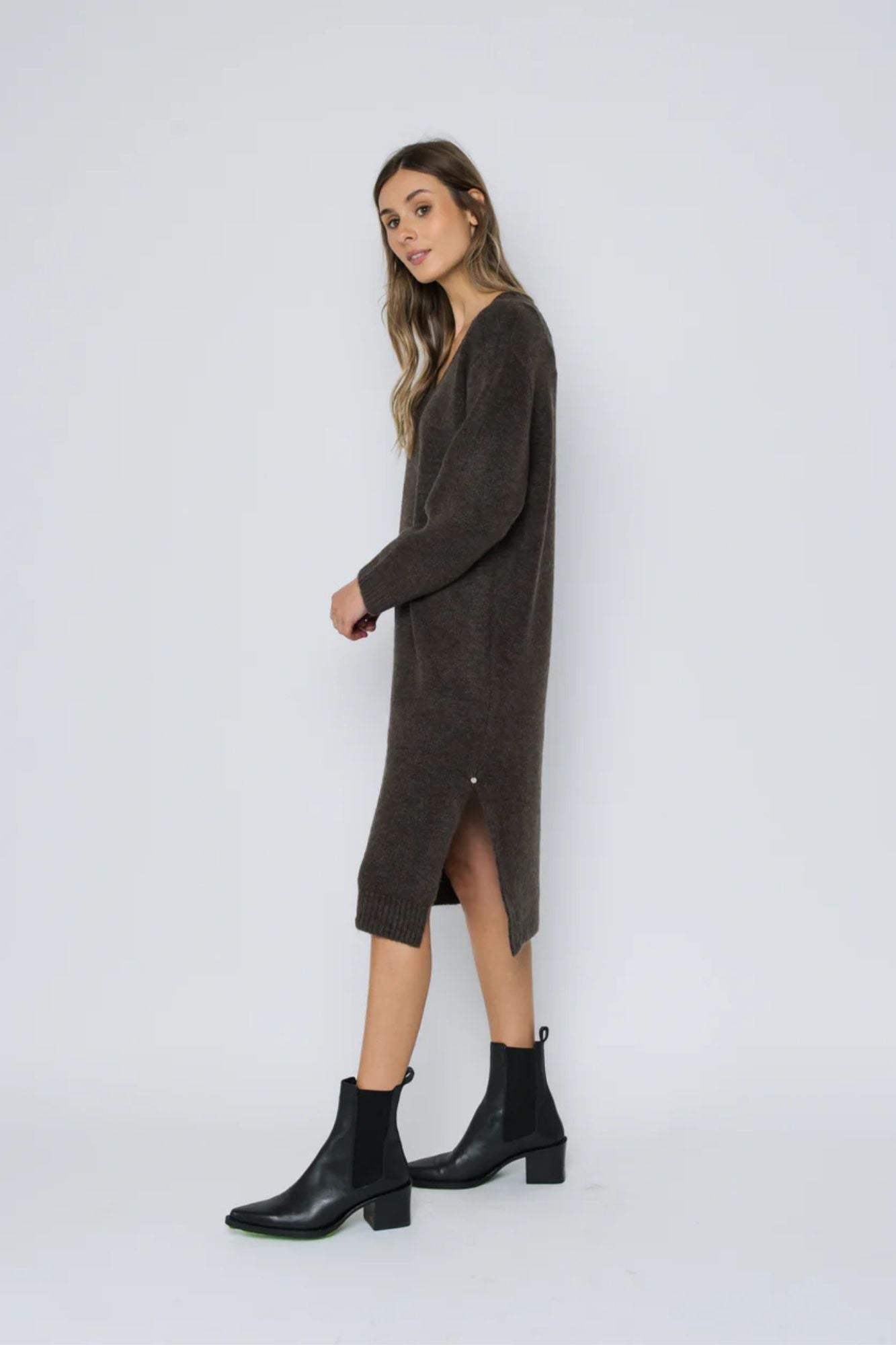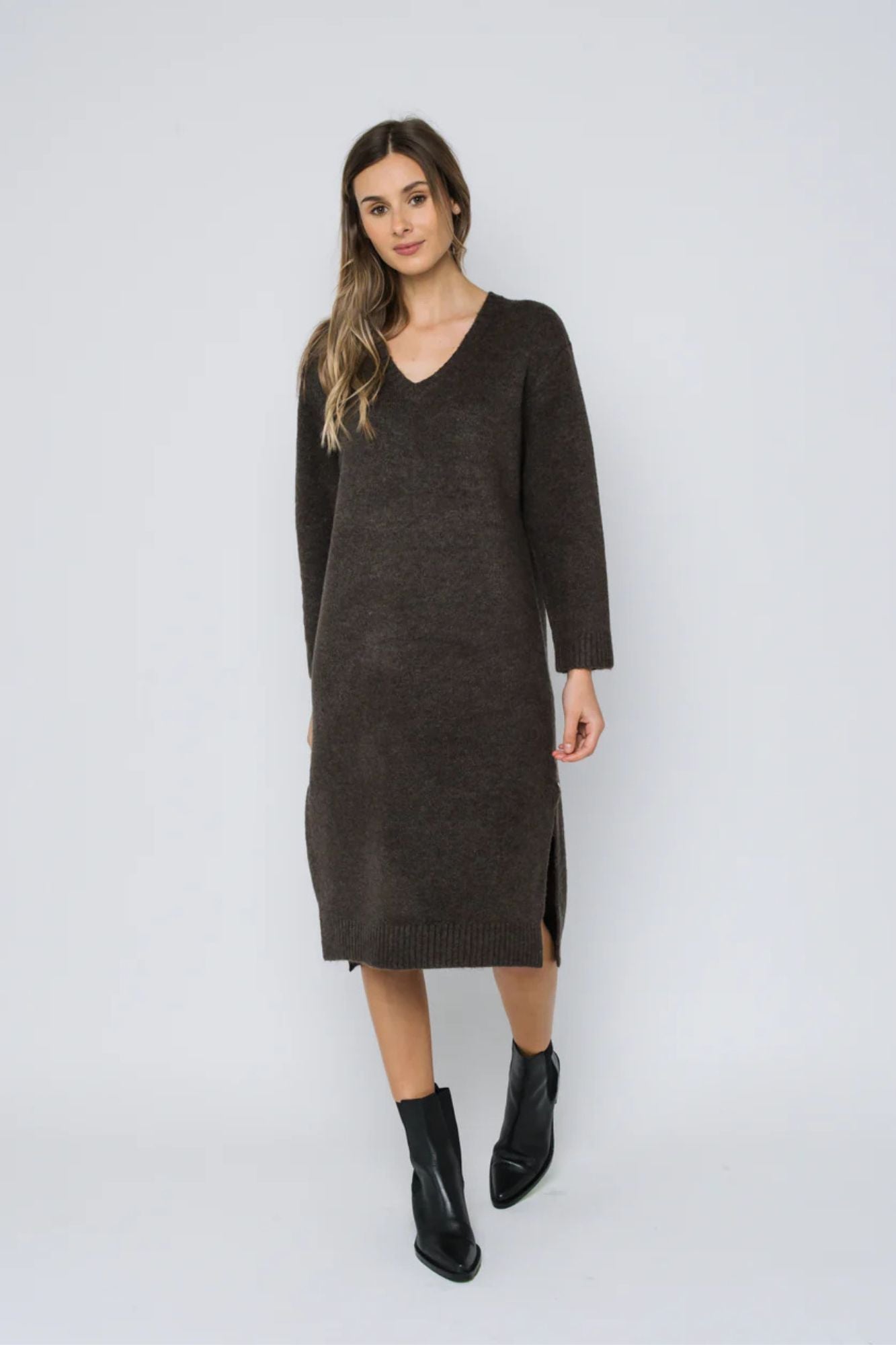 Get ready to lounge in style with the Sloane Maxi Sweater Dress. This versatile dress is perfect for everyday wear, with a cozy, robe-like feel that you won't want to take off. The midi length, high v-neck, and side slits give it a loose yet flattering fit. Pair it with sneakers, heels, or boots for a chic, comfortable look.