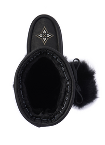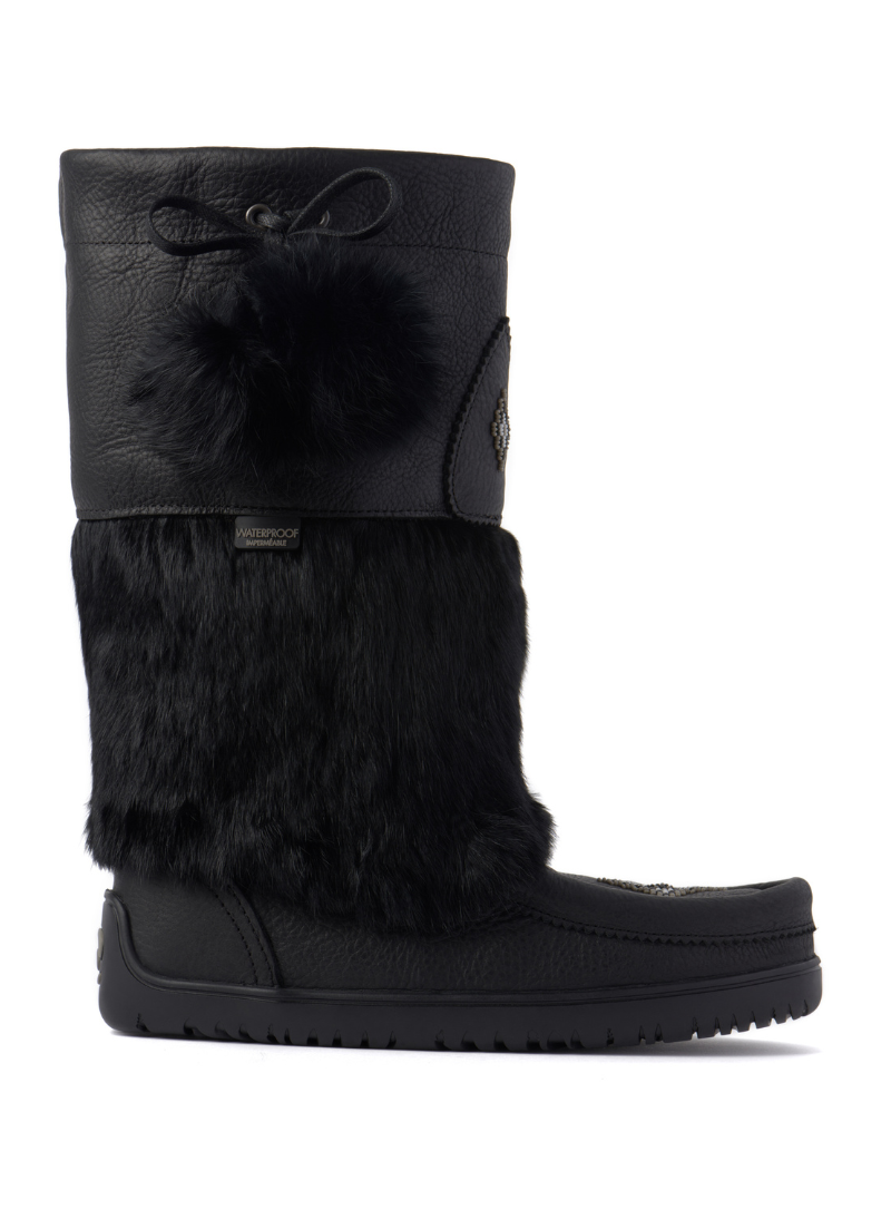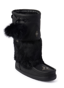 The women’s SNOWY OWL Mukluk is an iconic style passed down by generations of this proudly contemporary Métis company. This ‘mukluk’ or winter boot combines traditional style with modern techniques and materials. It features an ultra-soft sheepskin shearling lining and footbed. The full-grain leather upper is decorated with authentic beadwork and stitching. Rabbit fur trim along the ankles enhances warmth. An Authentic Waterproof System inspired by traditional pine pitch and spruce gum treatments ensures a snowproof seal 4” from the bottom. The durable ‘Tipi’ outsole is the result of a partnership between Vibram and an Indigenous artist.