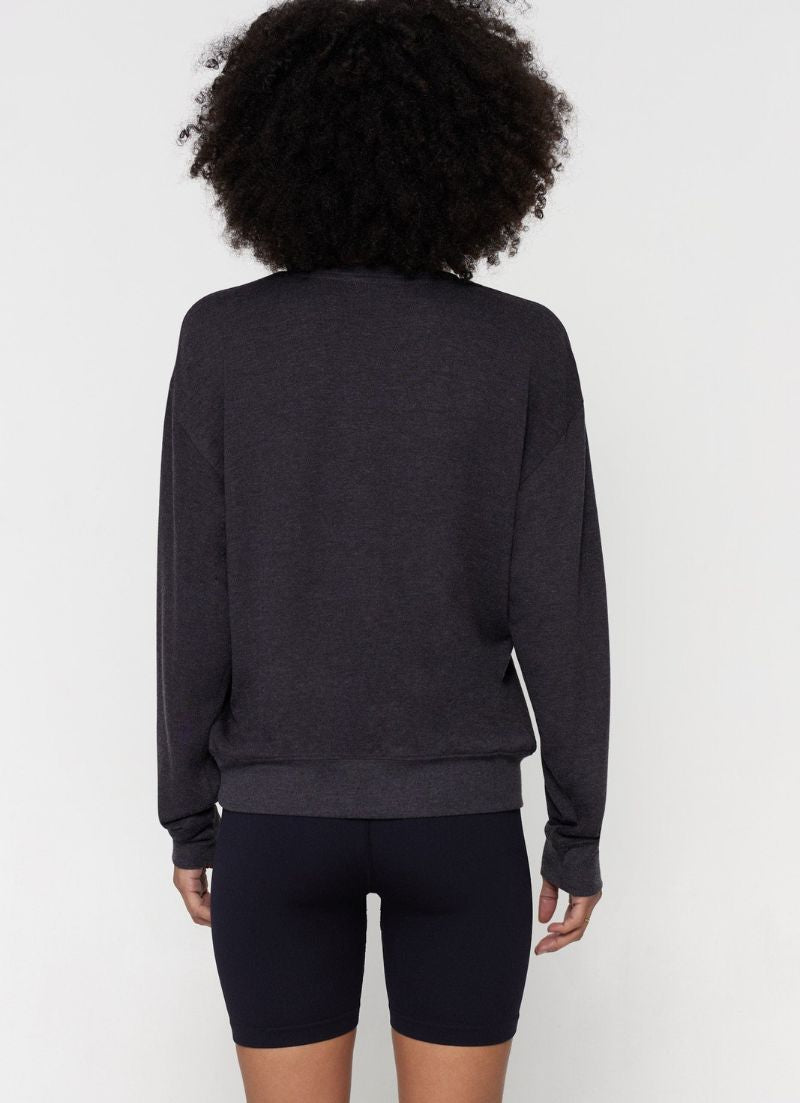 This is the perfect post flow sweater on its own or layered over a tank. Features include a relaxed, roomy fit, classic crew neck, rib trims, dropped shoulders and foil shine accents.