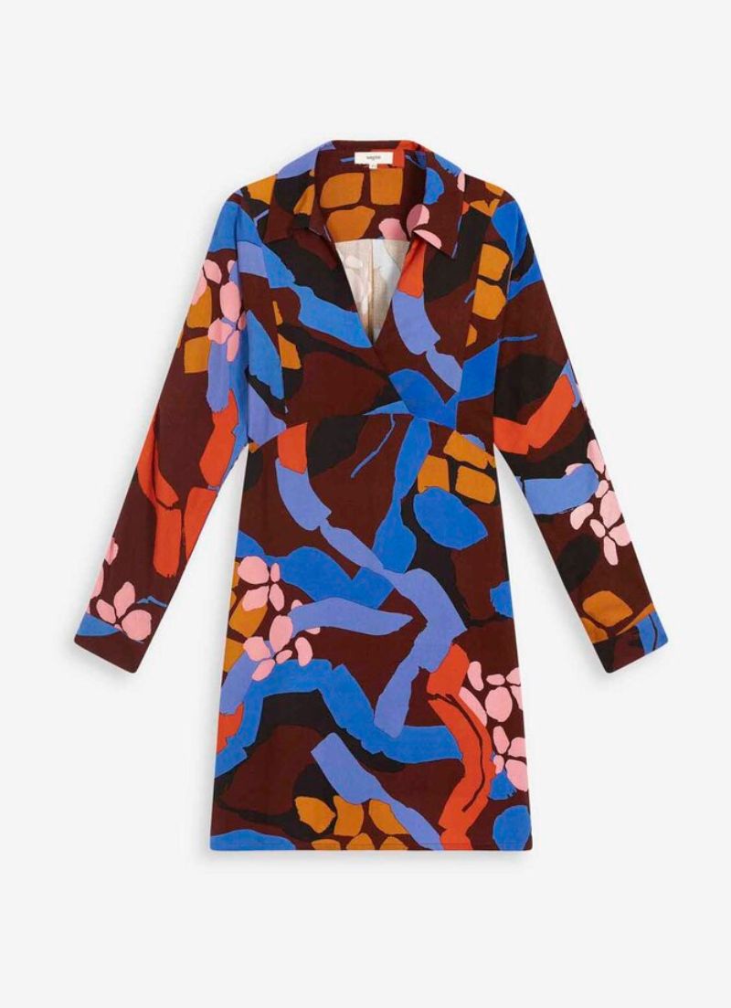 A colourful arty floral print fluid short dress featuring a shirt collar, v-neck, long sleeves and buttoned cuffs.