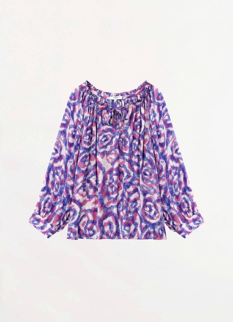 This spiral print fluid blouse features a v neck, little ruffles on the collar, tone-on-tone drawstring to tie and long slightly balloon sleeves.
