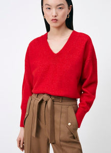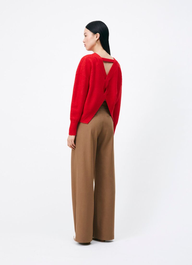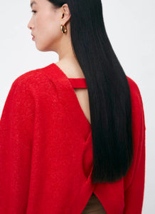 A backless delicate and thin sweater. Featuring speckled detailing, a v-neck front and back, tone-on-tone braided details and long sleeves.