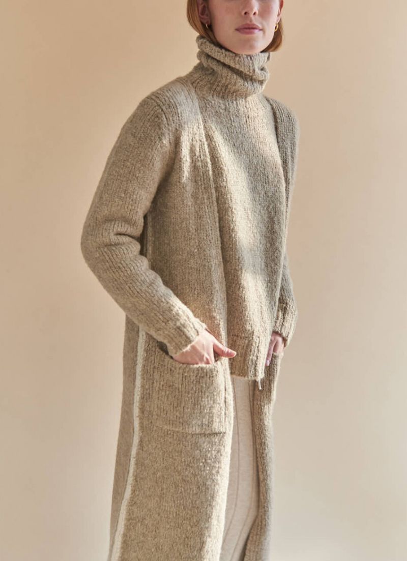 A maxi cardigan made in a thick knit. Featuring front pockets and contrast stripe details on the sides.