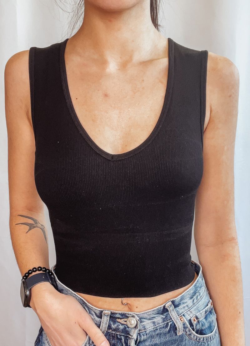 The Sylvie Tank is soft, stretchy and can be paired with anything. Wear it on its own or underneath a dress or slouchy sweater. One side includes a scoop neckline and the other is a high square neckline.