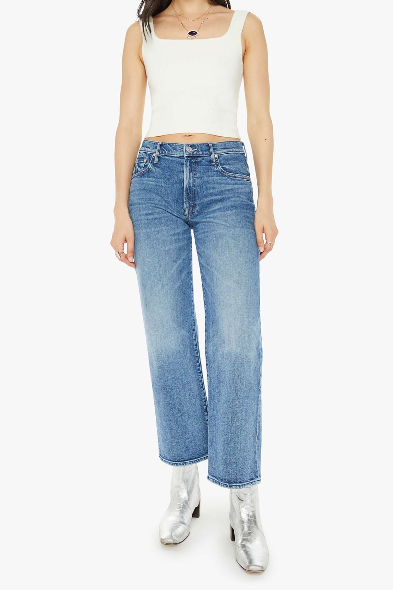 Embrace your inner witch with The Mid Rise Maven Ankle jeans. Made from sturdy SUPERIOR denim in a mid-blue wash, these jeans feature a relaxed fit, wide leg, and ankle-length inseam. Plus, they'll give you that killer "resting witch face" look. Toil and trouble never looked so good!