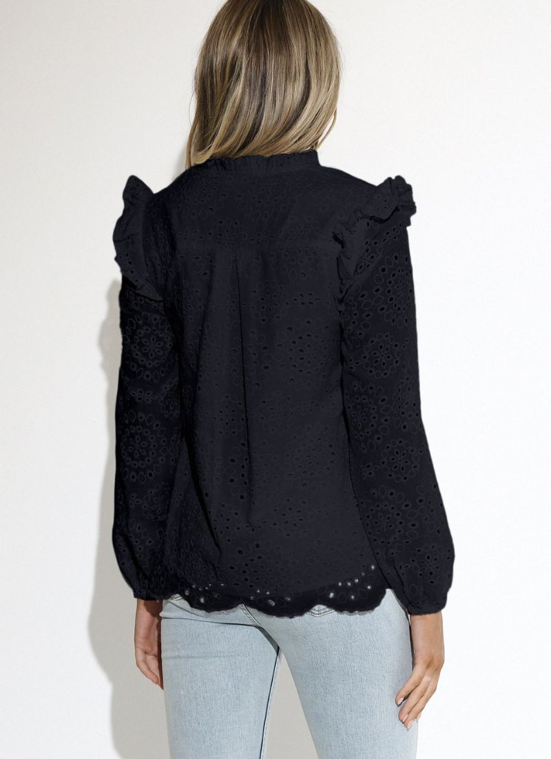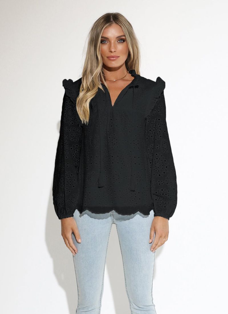A black lace, long sleeve blouse featuring a shallow v-neck with tassel detailing, elasticated wrists and a scalloped hemline.
