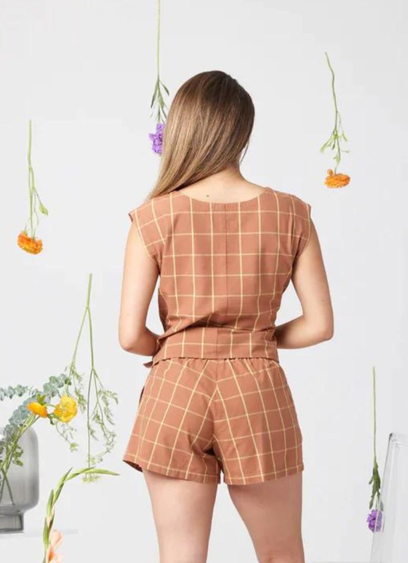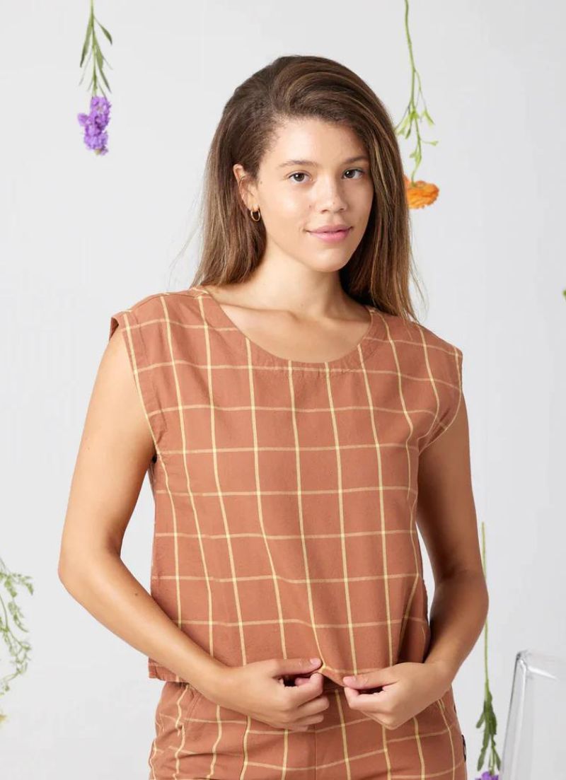 Sleeveless plaid crop top. Features a scoop neck in the front and back. A perfect complement to high waisted denim and linen!