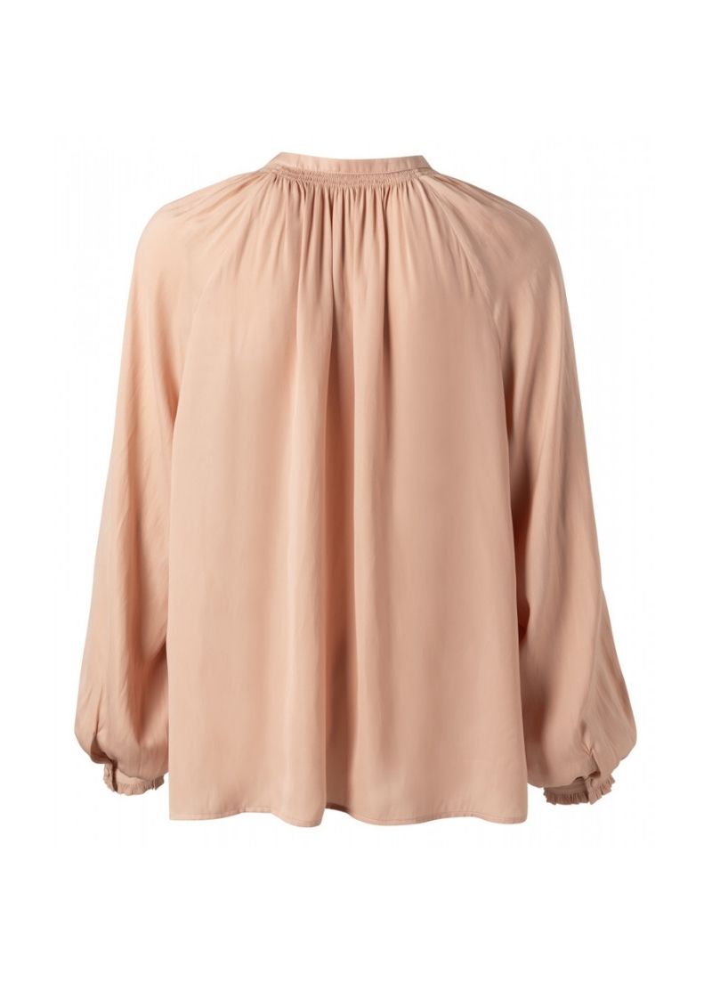 Romantic details compliment this easy to wear long sleeve blouse. Features gathered details at neckline and wrists. Tie at neckline.