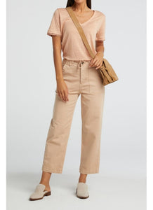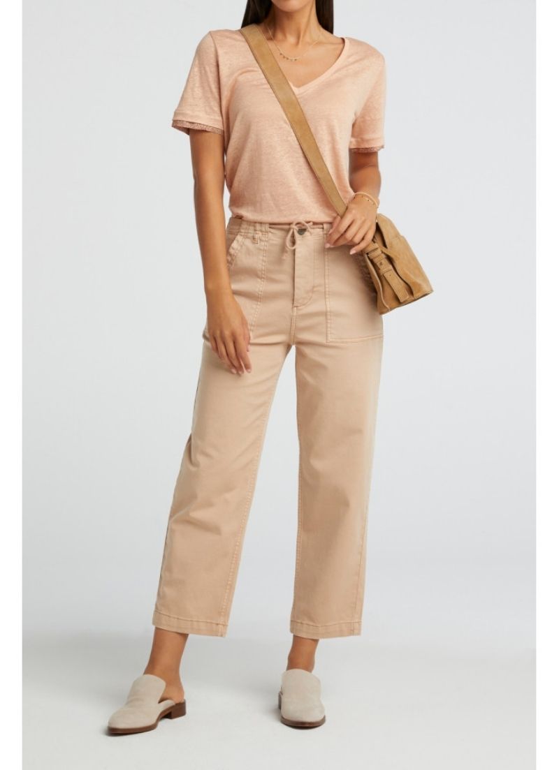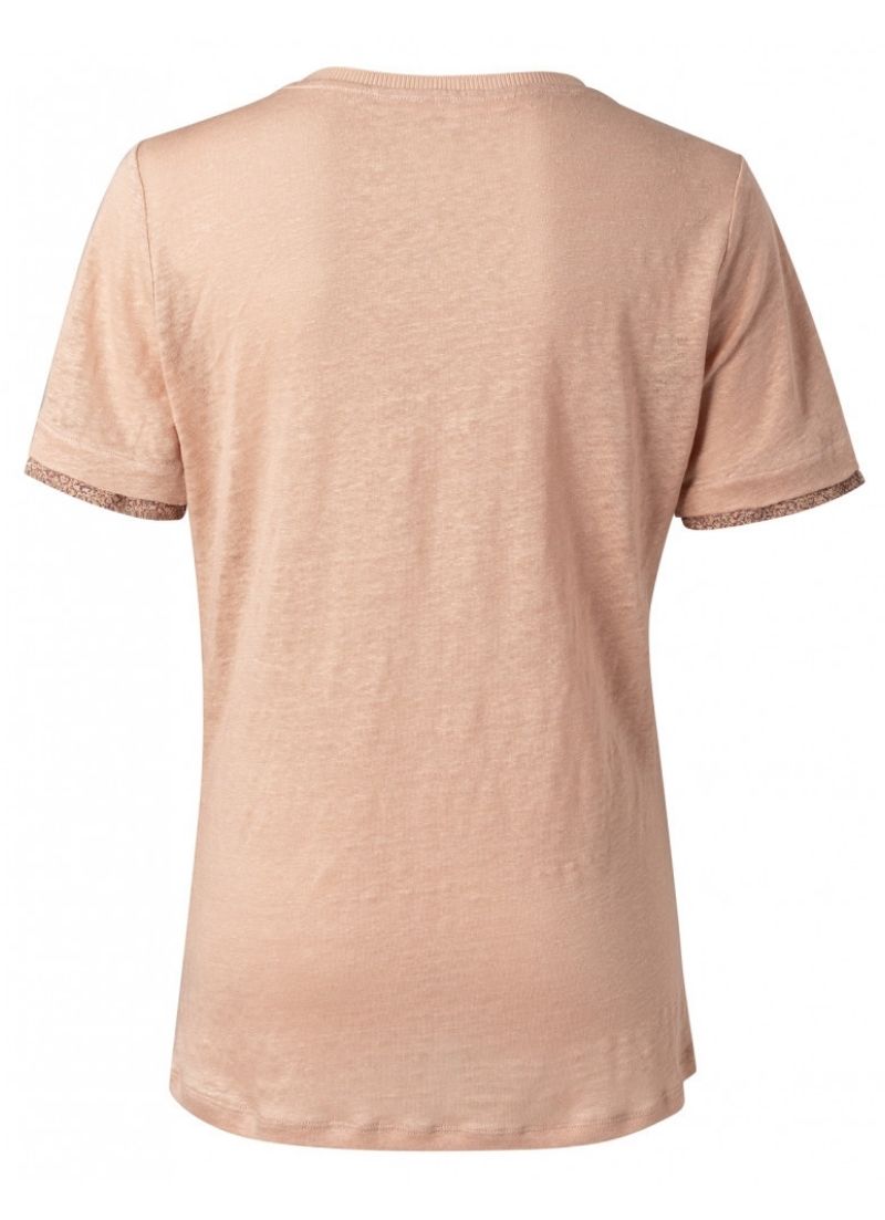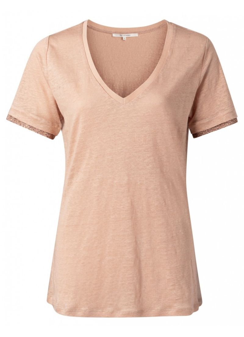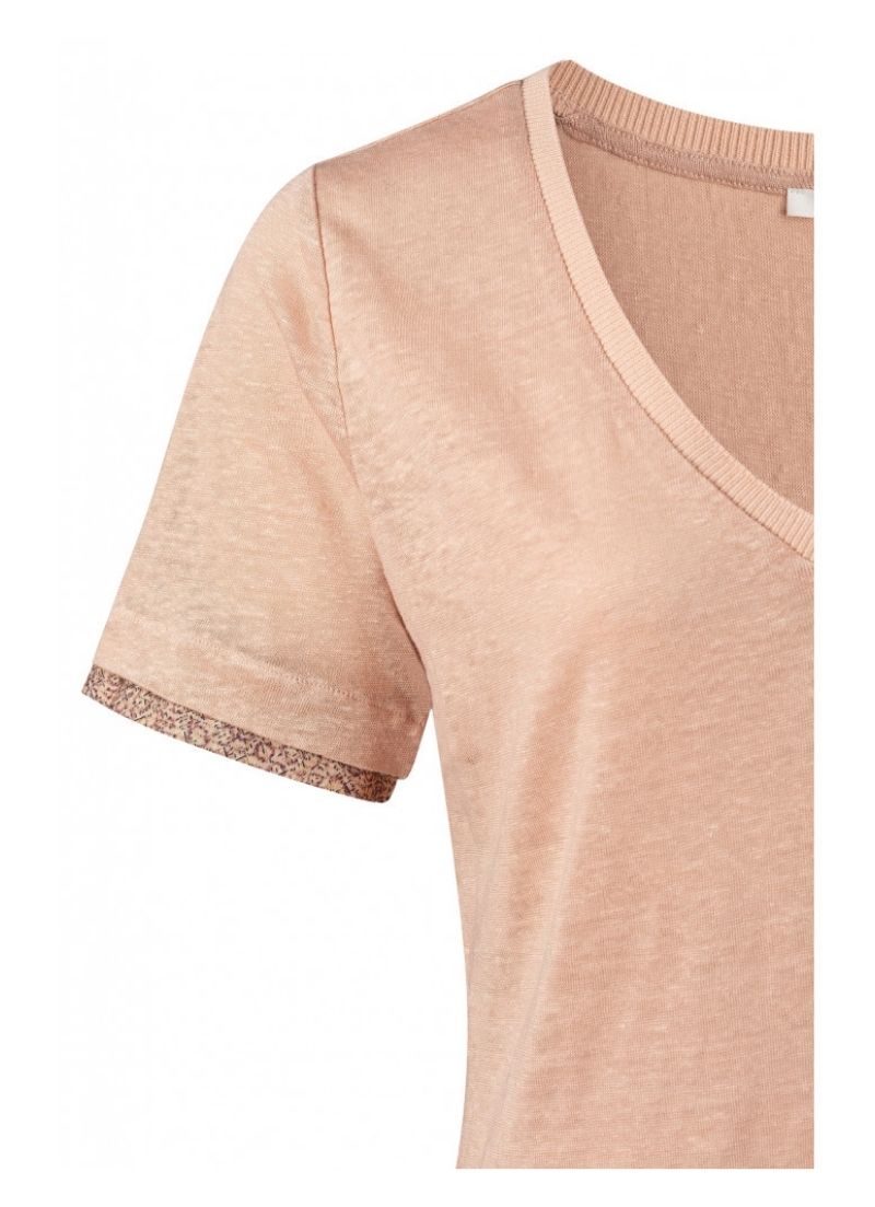 Details matter. This linen V neck tee delivers with woven floral print fabric at cuffs.