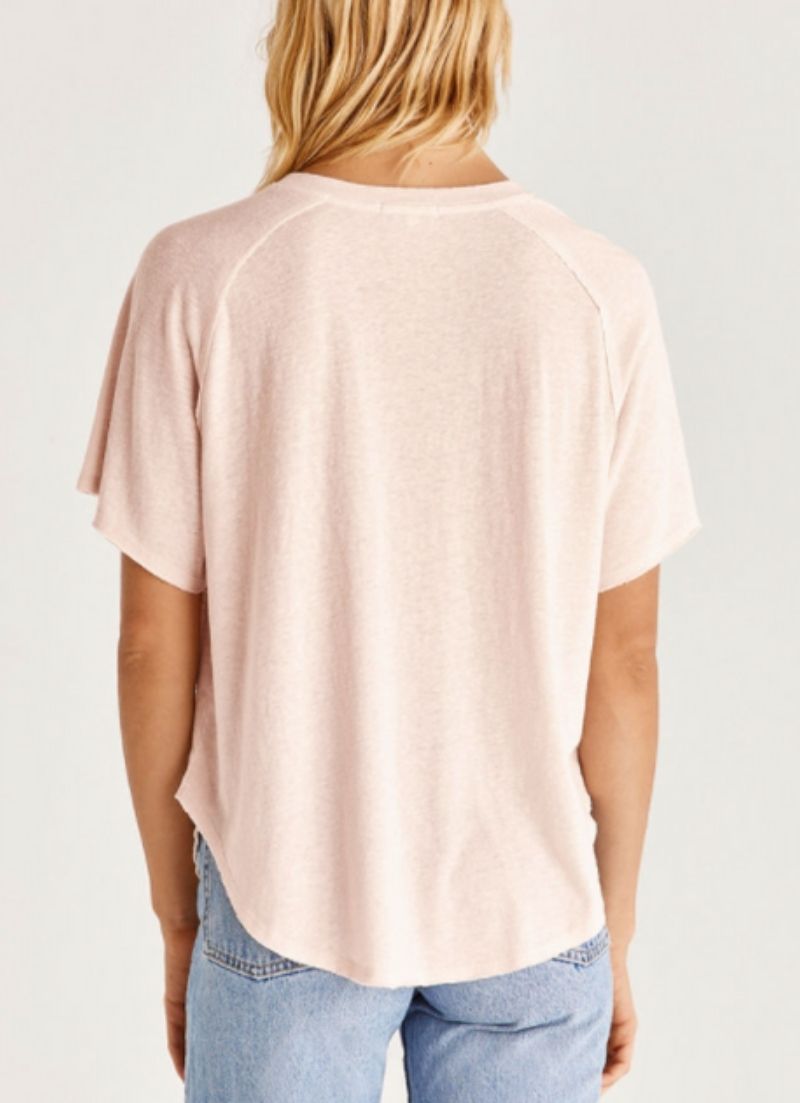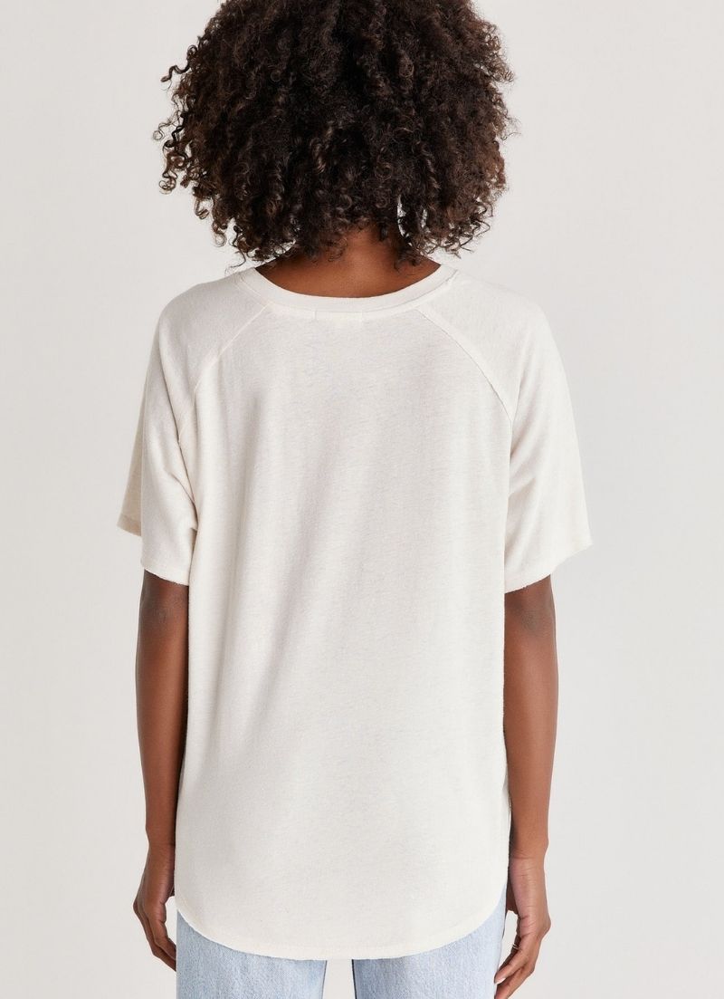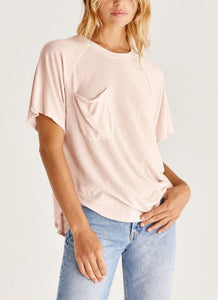 The Carly Pocket Tee is a staple with its raglan sleeves, signature slouch pocket, and raw edge details. This tee features an easy, relaxed style.