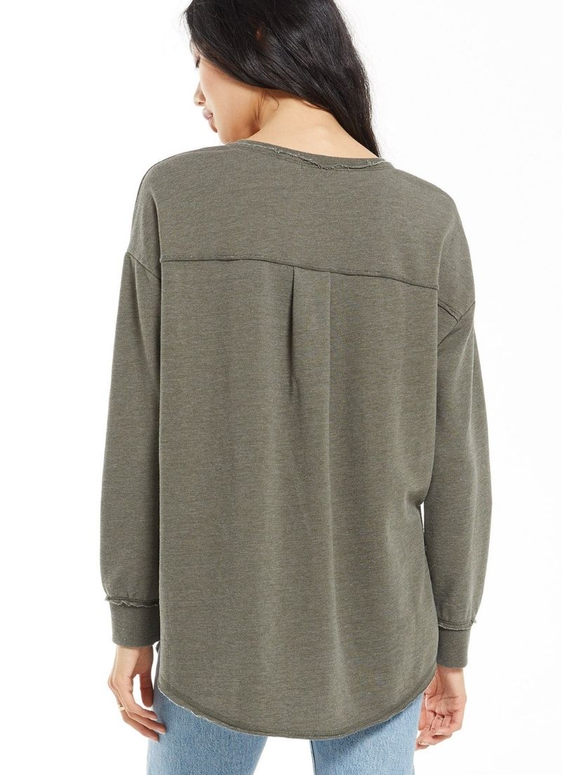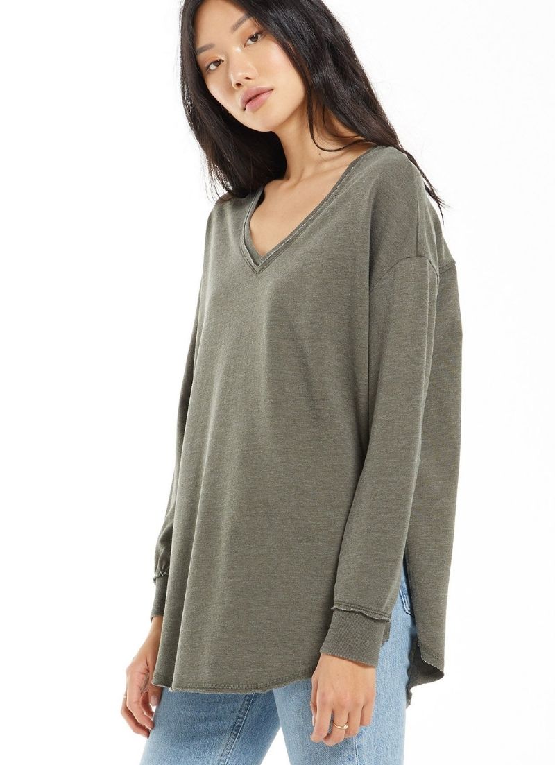 A new Weekender silhouette to love! The V-Neck Weekender features our much loved oversized design, given a flattering new v-neckline, with exaggerated side slits and a raw edge hem with ribbed accents. This easy-to-wear top will become a go-to fall favourite.